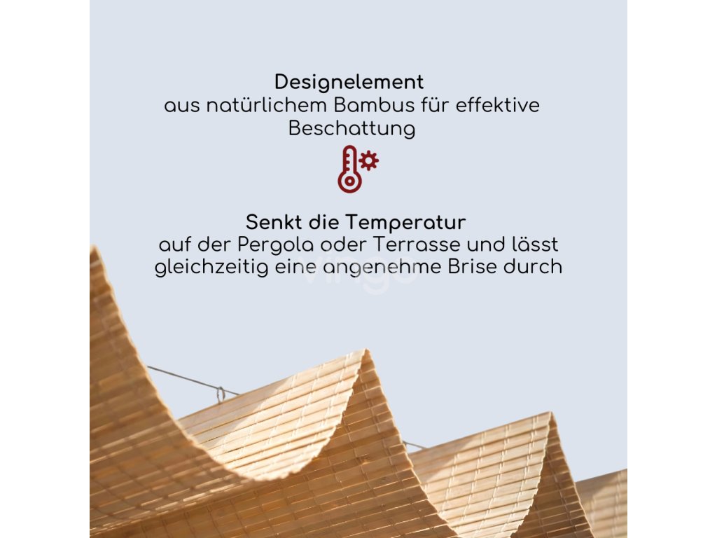 Heiß unter der Pergola? Bambus-Sonnenschutzdach für Pergolen in Braunfarbe – ein eleganter und praktischer Schattenspender unter einem Polycarbonatdach. Reduziert die Temperatur, ist einfach zu montieren und zu handhaben und in zwei Farben und Längen erhältlich.