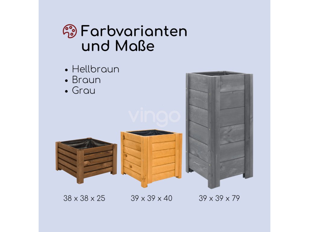 - Praktisch: Der Holzgartenkasten ermöglicht das ganzjährige Pflanzenwachstum. Er ist geeignet für niedrige und hohe Pflanzen, Blumen, Kräuter sowie kleine Bäume. Die Maße des Kastens betragen 38 x 38 cm bei einer Höhe von 25 cm.